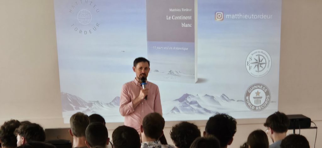 Jeudi dernier Matthieu Tordeur est venu rencontrer les élèves de terminale. Matthieu Tordeur est un aventurier et conférencier membre de la Société des Explorateurs Français. Il a fait le tour du monde au volant d’une 4L pour promouvoir la microfinance, couru 250 km dans le Sahara, traversé l’océan Atlantique à la voile, l’Europe à vélo et le Groenland en kite-ski… En 2019, Il est devenu le premier Français et le plus jeune au monde à rallier le pôle Sud en solitaire, à ski et sans ravitaillement. Communicant passionné, ses expéditions sont des plateformes de sensibilisation au dérèglement climatique et à la protection des régions polaires. De la Patagonie au Pakistan en passant par l’Antarctique, sont site recueille ses aventures à travers 100 pays sur les 7 continents.