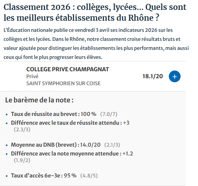 C'est avec joie et fierté que nous recevons les résultats du classement des collèges 2026. Le collège Champagnat est une nouvelle fois dans les meilleurs collèges du Rhône avec une très belle 2e place cette année. Il est encore cette année le meilleur collège des Monts du Lyonnais. (Classement collège Rhône 2026).