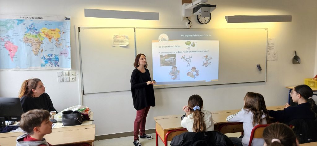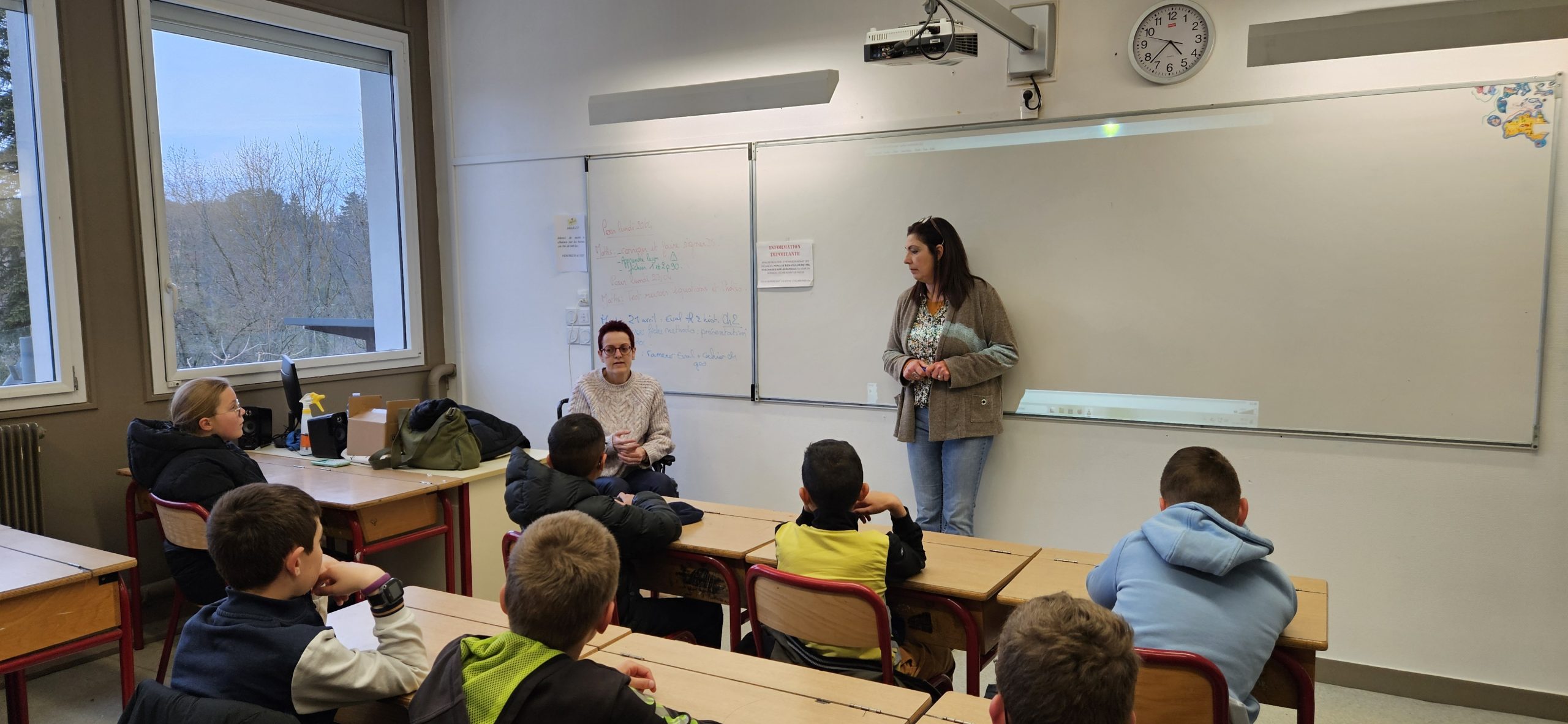 Mercredi 1er avril, les élèves de 6e ont participé à une formation humaine consacrée à la découverte du handicap. Cette intervention a réuni plusieurs professionnels et témoins : Jocelyne Latour, psychologue spécialisée en neuropsychologie ; Jézabelle Frachisse et Tiphaine Jacoud, éducatrices spécialisées à l’APF France Handicap ; Nathalie Bouteuille, du service de la vie sociale de l’ADAPEI, également impliquée en médiation animale ; Marie-Rose Arbore, aveugle de naissance ; Nadiège Parthenay, atteinte de sclérose en plaques ; ainsi que Véronique Lucet, professeure des écoles spécialisée.